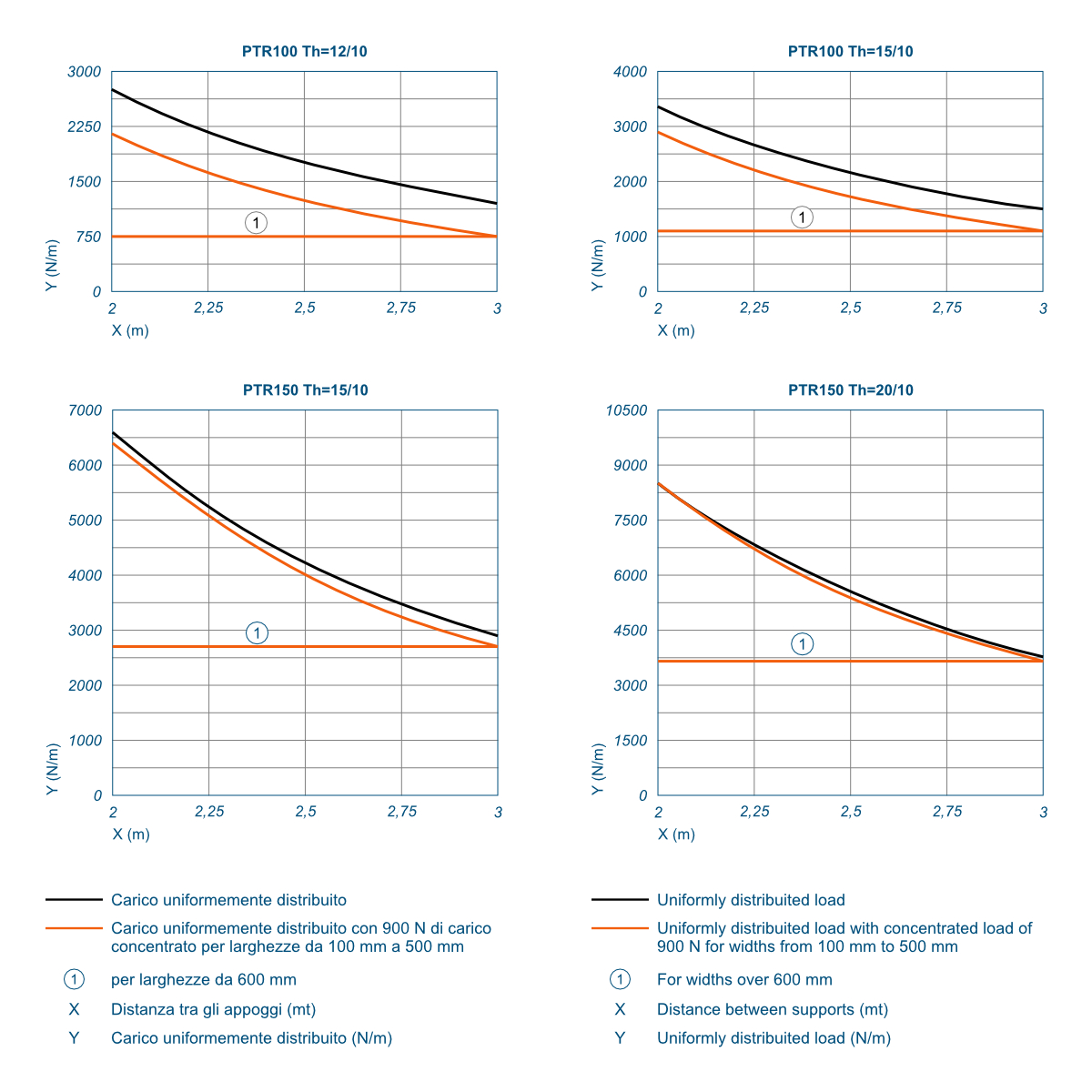 Cable ladders PTR type have been tested through strict tests, to define the maximum admissible load (SWL – Safe Working Load) in compliance with the CEI EN 61537 standard; please find herewith enclosed the diagrams which define, according to the distance between supports, the maximum admissible distributed load (UDL – Uniformly Distributed Load) and the maximum admissible load considering an additional concentrated load (CL – Concentrated Load); as concentrated load we consider a load of 900 N added in the middle span with respect to the supports.