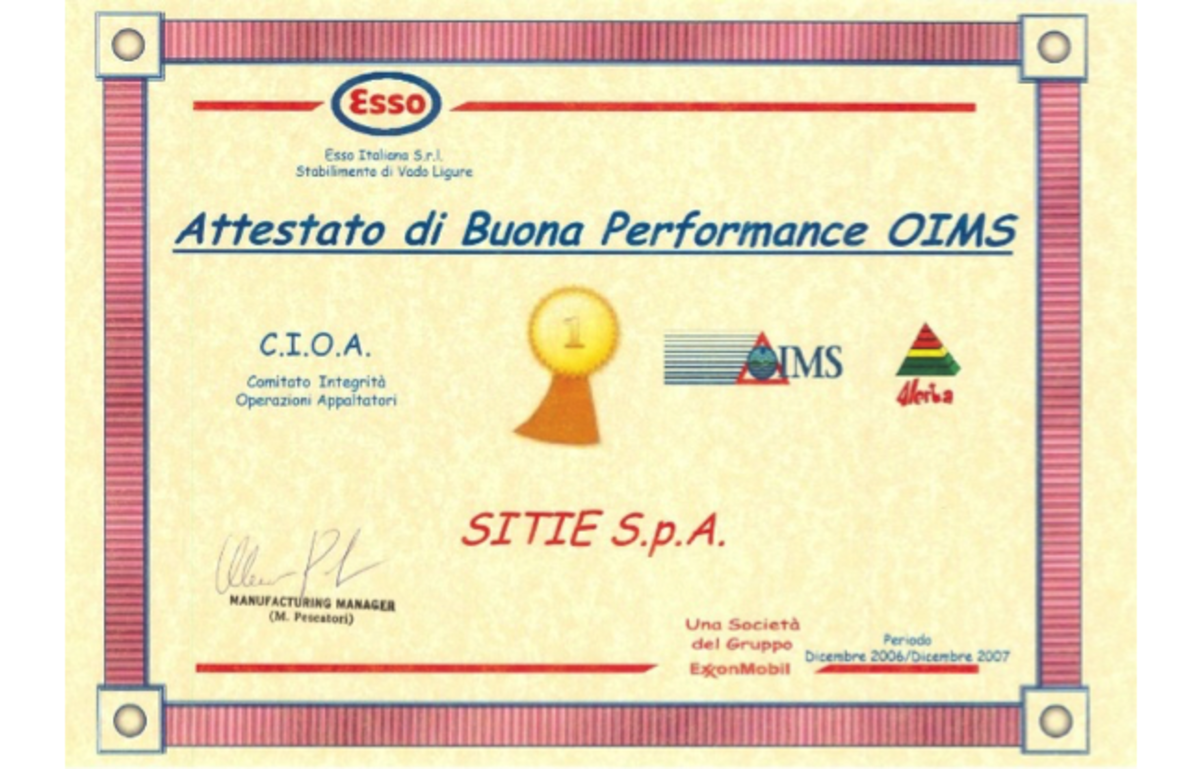 SITIE received the certificate of Good Performance O.I.M.S. from Esso – Vado Ligure (SV) Working Site