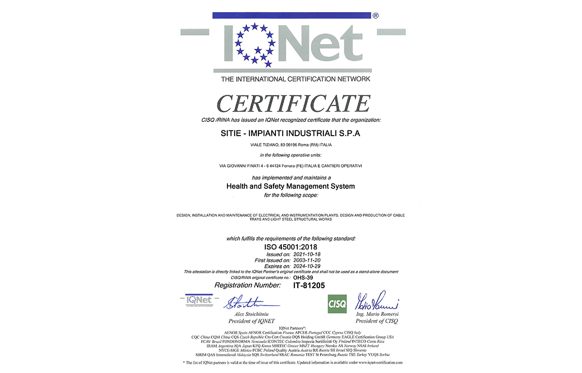 The certified company System, integrated with the requirements of the quality and environment standards, strengthens the culture of health and safety in the workplace and makes the reduction of all risks the fundamental element to be pursued towards the Customer and all interested parties .